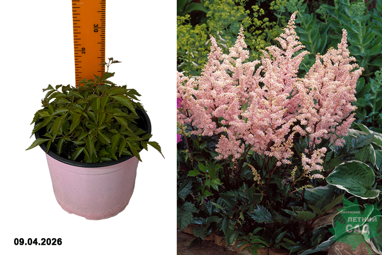 Один из лучших сортов этого вида. Листья зеленые, дважды перистые, ажурные, глянцевые, края листочков бурые. Цветки мелкие, многочисленные, лососево-розового цвета, соцветия средней плотности, метельчатые, длиной 10-15 см. Диаметр кроны взрослого растения 50 см. Высота взрослого растения 50-60см.