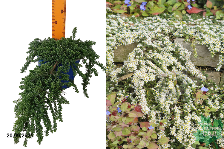 Травянистый многолетник, цветущий с сентября по ноябрь. В ширину расползается до 100 см. Цветки мелкие, белоснежного цвета. Садоводы ценят за декоративный внешний вид, неприхотливость и тонкий аромат. Куст состоит из удлиненных побегов 70-100 см длиной, как правило, они разветвлены. Стебли покрыты листками — сверху они маленькие (1-1,5 см), зубчатые, снизу – длинные (до 6 см), плотные, лапчатые. Листовые пластины имеют глубокий темно-зеленый цвет, располагаются густо. Отличается стойкостью к морозам, растение может выдерживать затяжные холода, продолжительную засуху и частые перепады температур. Место посадки: солнце. Почва: обычная садовая. Хорошо смотрится в каменистых горках, миксбордерах, альпийских горках, рокариях, в массиве.