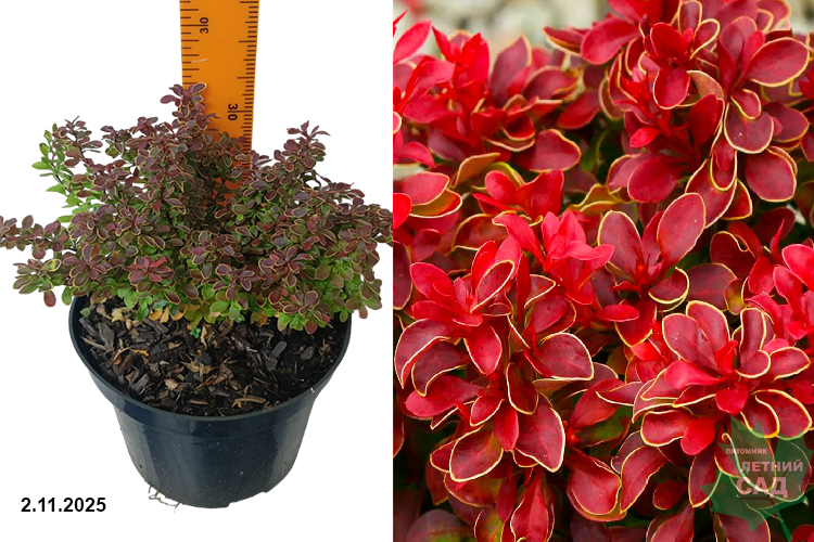 Низкий кустарник, который достигает до 55 см в высоту и до 90 см в диаметре. В первое время крона этого растения небольшая и имеет сферическую форму. Однако со временем кустарник разрастается. Листовые пластинки округлой формы, небольшого размера (длина примерно 1-2 см). Их поверхность блестящая. Окраска листвы красная либо темно-оранжевая, с желтоватой либо кремовой окантовкой. Листья держатся на кустарнике до поздней осени. Цветы окрашены в розовый оттенок и начинают появляться в начале мая. Они собираются в небольшие соцветия по 3-4 штуки. В это время куст выглядит особенно красивым. Уже осенью на месте цветов появляются горьковатые ягоды красного цвета. В пищу их не используют. Но их преимущество в том, что такие ягодки украшают куст даже в холодное время года. Если правильно сформировать куст, то через несколько лет у него будет аккуратная и красивая крона. Растет барбарис медленно. Годовой прирост в высоту составляет до 4 см, в ширину до 8 см. Барбарис можно выращивать даже в горшках. Используется в групповых посадках для создания кустарниковых миксбордеров, в композициях с хвойными растениями, в каменистых садах.
