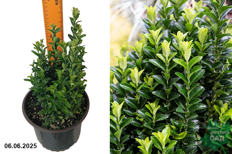 Вечнозеленый компактный куст с кроной в виде колонны. Высота взрослого растения достигает 2−3 м. Форма плотных листьев с зубчатым краем овальная. Их украшают серебристые прожилки. В июне распускаются мелкие цветочки желтоватого оттенка.