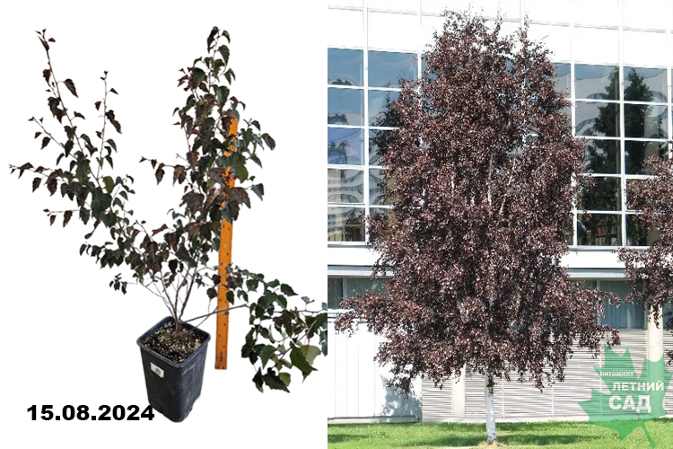 Неприхотливое дерево с пирамидальной кроной и декоративной листвой, высотой до 9 м. Особую декоративность придает сочетание бордово-пурпурной окраски листьев, имеющих глянцевую поверхность, и белого ствола. У молодого растения кора бронзовая, и только с возрастом приобретает эффектную белую окраску. Ствол прямой. Листья ромбические, длинночерешковые, заостренные; молодые - клейкие, более старые - голые и блестящие.