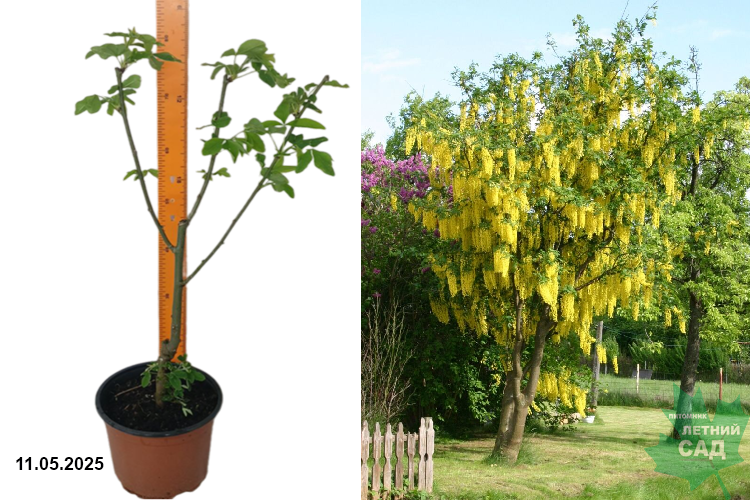 Потрясающей красоты небольшое деревце, дорастает до 5 м высоты и такого же диаметра, прирастает около 20 см в год. Цветки золотисто - жёлтые, собранные в эффектные длинные кисти, длиной около 50-60 см. Цветёт в мае-июне. Листья трехлистные, клевероподобные, средне-зеленые. Требует солнечных мест.