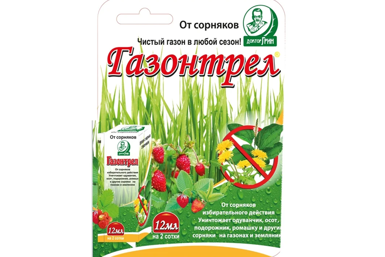 Газонтрел 12 мл - гербицид, средство избирательного действия от сорняков на газоне. Уничтожает одуванчик, все виды осота, подорожник, ромашку и другие сорняки на газонах и землянике. Средство хорошо проникает в листья сорных растений и быстро передвигается в точку роста, корни и корневища, прекращая их рост.