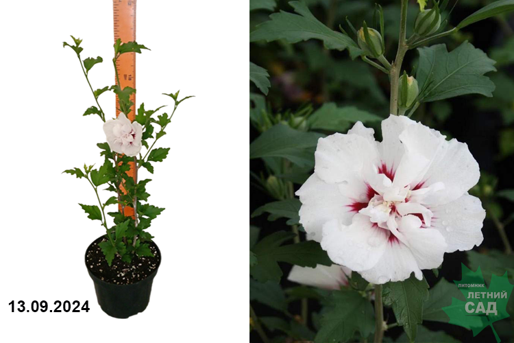 Листопадный кустарник высотой до 2 -3 м. Диаметр взрослого куста – 1,5 м. Можно выращивать как штамбовое дерево. Листья овальные, насыщенно-зеленой окраски, до 10 см в длину. Зацветает в начале лета, цветение продолжается до начала октября. Цветки крупные, 10 – 12 см в диаметре. Расцветка цветков белая с темно-красными лучиками на лепестках у сердцевины.