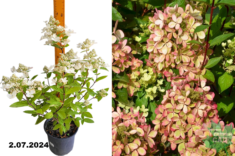 Декоративный кустарник аккуратный, достаточно компактный, шириной около 1,2 м, в высоту достигает 1-1,5 м. Главное достоинство сорта - меняющие цвет лепестки соцветий. За лето они успевают сменить окраску несколько раз: здесь и белые, и кремовые, и фисташковые, и лососевые, и розовые, и винные оттенки. Соцветия конусообразные, пышные, достаточно крупные 15-20 см в длину. У цветков четыре лепестка округлой формы. Цветет со второй половины июня до начала сентября. Листья каплевидные, блестящие, насыщенного зеленого цвета. Отлично растет на солнце, допустимо небольшое затенение.