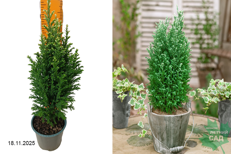 Среднерослое медленнорастущее, вечнозеленое, редкое хвойное растение. Природная колонновидная форма легко переносит стрижки и обрезку. Его высота редко превышает 120–130 см, чаще куст останавливает свой рост на отметке в 100 см. Растение прибавляет в росте не более 10 см в год. Ветви растут очень густо, отходя от ствола вверх под острым углом. Хвоя игольчато-чешуйчатая, короткая, тупая, окраска зелено-синеватая, с кремово-белыми кончиками. Осенью на деревце созревают мелкие коричневые шишки округлой формы. Внутри образуются семена, снабженные крылышками. Растение превосходно смотрится в одиночной и групповой посадке. Любит светлые или слегка затененные участки.