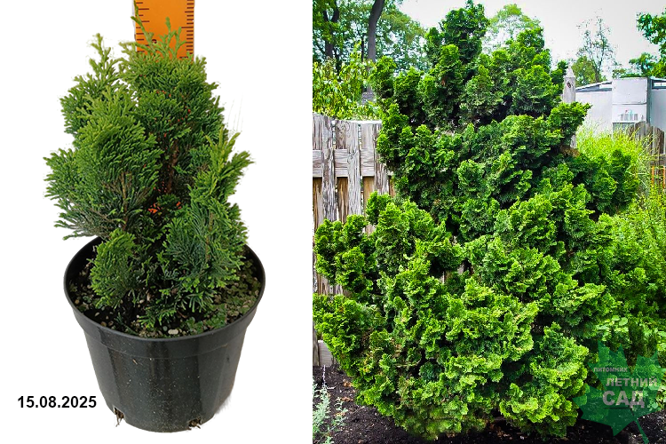 Медленнорастущий кустарник с неправильной ширококонической кроной высотой до 1,5-2,5 м и диаметром до 1-1,5 м. Ветвление плотное, имеет форму скрученной раковины и блестящую, темно-зеленого цвета, хвою. Она приятна на ощупь, мягкость обусловлена множеством маленьких чешуек, расположенных на поверхности каждого ответвления. Цвет коры окрашен в бордово-коричневый цвет, а поверхность имеет гладкую текстуру с небольшими шероховатостями. Для нормального роста и развития требует плодородные влажные почвы. Предпочитает полутень, но может расти и на солнце. Подходит для одиночных и групповых посадок, для альпийской горки, в качестве бордюрного растения. Может выращиваться в контейнерах.