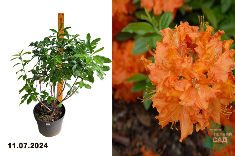 Рододендрон (Азалия) Гибралтар - густорастущий раскидистый кустарник семейства вересковых. Размер: 1,5-2 м высотой и шириной. Скорость роста средняя. Многочисленные оранжевые цветки с загнутыми лепестками; крупные, в форме колокольчика или чаши, собраны в соцветия по 5-10 штук и достигают 8 см в диаметре. Листья при распускании бронзовые, затем темно-зеленые, осенью изначально малиново-красные, затем оранжево-желтые. Эти кустарники хорошо растут на склонах. Азалия Gibraltar цветет в середине мая - до начала июня.