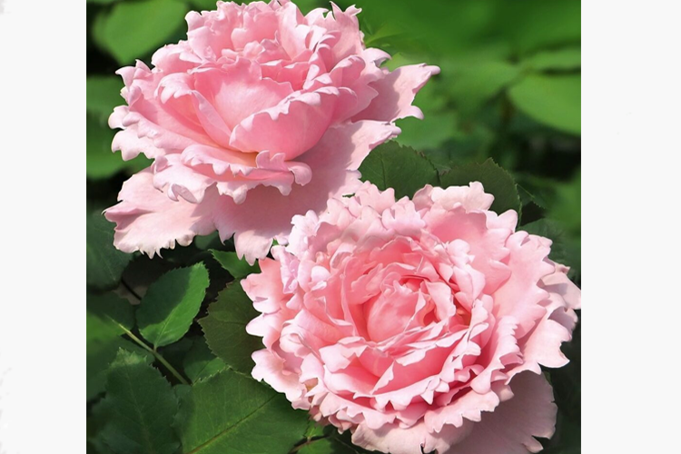 Куст компактный, до 90 см высотой, ширина 40-60 см, листва зеленая, матовая. Цветки этого сорта крупные, до 12 см диаметром, махровые, нежно-розового цвета, их отличают фестончатые края лепестков и очень яркий аромат, напоминающий парфюм, с нотками сирени, розовой пудры и лимона. Цветение обильное, повторное, вплоть до заморозков.