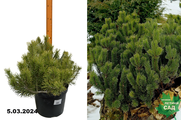 Кустарниковая форма густой сосны. Растет медленно. Распростертая стелющаяся крона. Вырастает до 2-3 м в высоту, в диаметре до 2-3 м. Побеги короткие, изогнутые к верху. Ежегодный прирост 10 см в высоту и 12 см в ширину. Поверхность ствола покрывает бурая кора высокой плотности. Хвоя темно-зеленого цвета, длиной около 4 см, собрана по две хвоинки, игольчатая, иногда перекрученная, жесткая. С 6-8 лет начинают появляются шишки. Шишки светло-коричневого цвета, ширококонусовидные, сидячие, около 3-6 см. Крепкие ветви не подвержены разломам под тяжестью снега. Светолюбива. К почвам нетребовательна, хорошо растет даже на бедных сухих грунтах, но предпочитает свежие хорошо дренированные суглинки и супеси. Используют для создания групповых и одиночных посадок, в смешанных композициях. Незаменима в садах японского стиля, в рокариях.