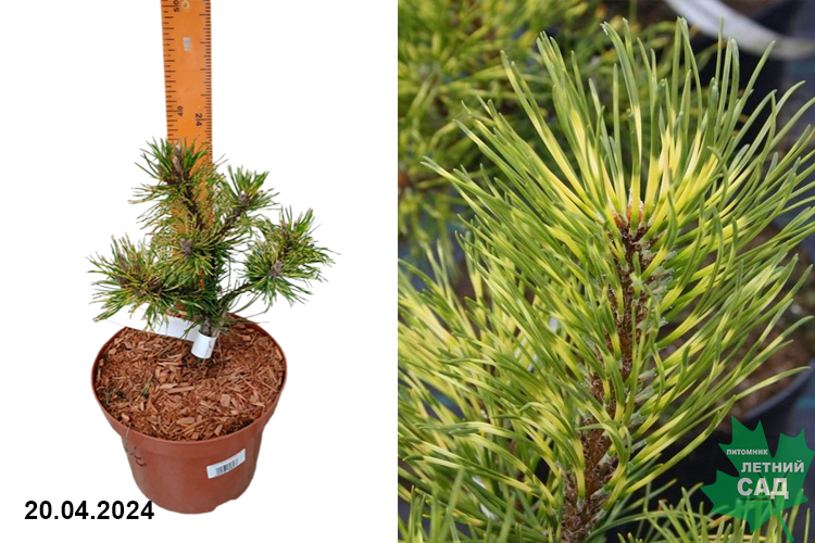 Карликовая горная сосна. Габариты взрослого растения составляют 1,5 м в ширину и приблизительно столько же в высоту. Форма кроны подушковидная. Годовой прирост равен приблизительно 5-8 см. Имеет двухцветную хвою, что подчеркивает ее необычный и привлекательный внешний вид. Иголки будто специально прорисованы таким образом, что одна половина иглы имеет зеленый окрас, а вторая половина – желтый. Благодаря этому создается необычный эффект свечения, который сохраняется в течение всего календарного года. Зимой желтый цвет хвои проявляется особенно ярко. Хвоя достаточно густая, не слишком колючая, обладает легким приятным ароматом. Хвоя не выгорает при прямом попадании ярких солнечных лучей. Кора гладкая, серо-коричневого оттенка, с последующим взрослением растения побеги покрываются темно-коричневыми чешуйками. Хорошо растет на солнечных участках. Если посадить в затененном месте, то сосна теряет яркость окраски. Благодаря необычной окраске хвои сосна часто применяется в ландшафтном дизайне. Она может выступать как самостоятельный элемент или быть частью групповой композиции. Идеально смотрится альпинариях, миниатюрных и каменистых садах, подходит для контейнерного озеленения.