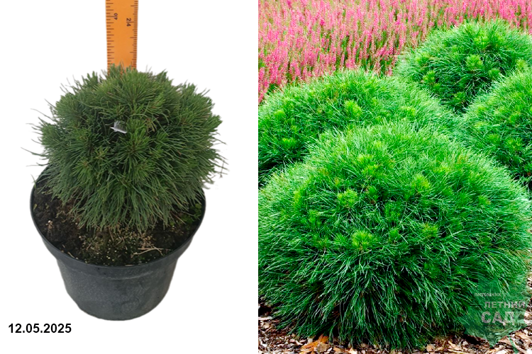 Оригинальный, карликовый сорт заслуживает самого пристального внимания садоводов. Крона формируется симметричная, плотная, густая, сначала шаровидная, но вскоре становится уплощенно-шаровидной или овальной со сглаженной верхушкой. Высота до 1,5 м, ширина 1,2 м. Хвоя длинная, темно-зеленая, тонкая, не жесткая, немного подкрученная, плотно расположенная на побегах. Скелетные побеги короткие, толстые, многочисленные, умеренно ветвятся, плотно прилегают друг к другу, разрастаются равномерно, отходят от центра под углом, направлены в стороны и вверх. Светолюбива, переносит полутень.