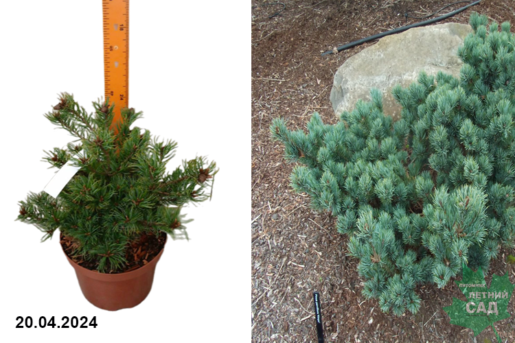 Карликовый медленнорастущий сорт с округлой формой кроны. Крона в молодом возрасте плотная, с возрастом становится немного разреженная. С сине-зелеными, длинными скрученными иглами. В зависимости от солнечного освещения, цвет хвои меняется от серебристо-зеленого до синего в облачную погоду.