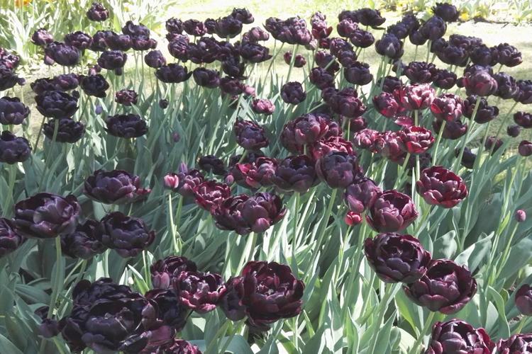 Роскошный махровый, почти круглый, тюльпан с уникальной окраской– по черному тону растушевка до темно-бордового или чернильно-фиолетового оттенка. Необычный, изящный, роскошный цветок. Зацветает в конце мая. Высота 50-55 см.