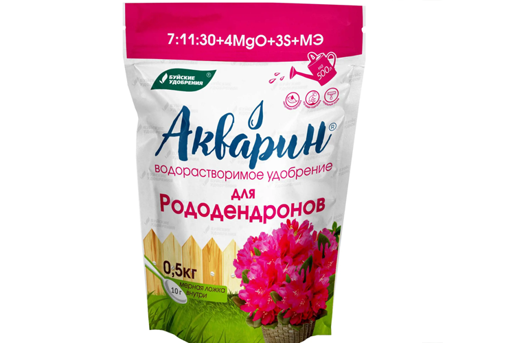 Акварин для Рододендронов - водорастворимое удобрение, в состав которого входит азот, фосфор, калий, магний, сера и микроэлементы – железо, цинк, марганец, медь в хелатной форме, а бор и молибден – в минеральной. Благодаря кислой реакции (рН) удобрения, оно легко растворяется в холодной воде и более эффективно усваивается корневой системой или листовой поверхностью растений.